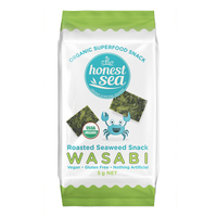 Organic roasted seaweed snack that are crunchy, papery thin and delicious! Enjoy this wasabi infused guilt-free snack. Perfect for Vegan and Gluten free diet.