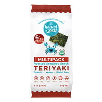 Organic roasted seaweed snack that are crunchy, papery thin and delicious! Enjoy this teriyaki infused guilt-free snack. These 6x5g multipacks are the perfect lunchbox solution and great for on-the-go snacking. Perfect for Vegan and Gluten free diet. Contains 6 pieces of 5g pack.