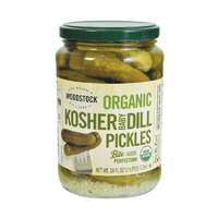 Crunchy organic baby dill pickles with the same zesty taste as the whole pickle! Woodstock Organic Kosher Baby Dill pickles are great as a snack or with a meal.